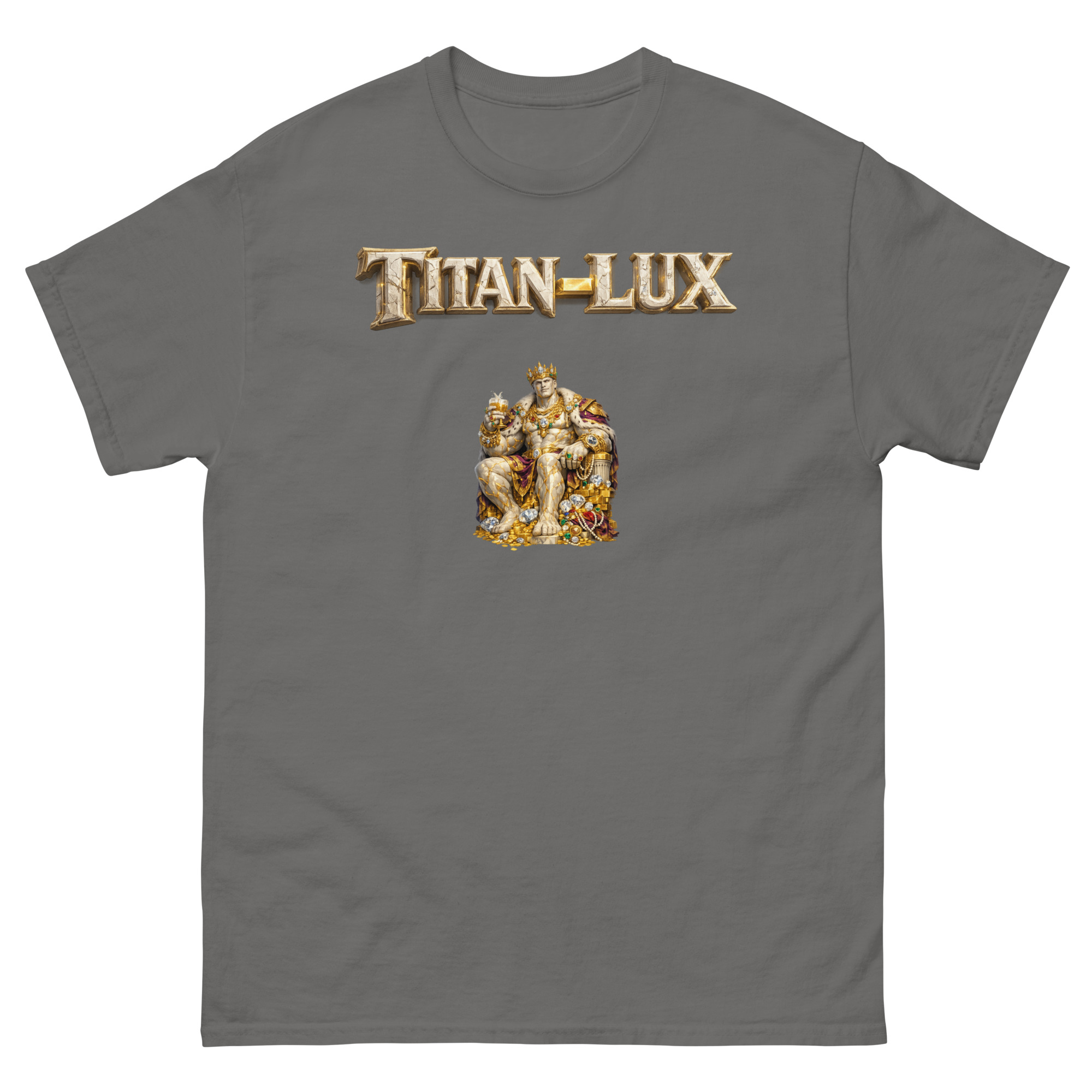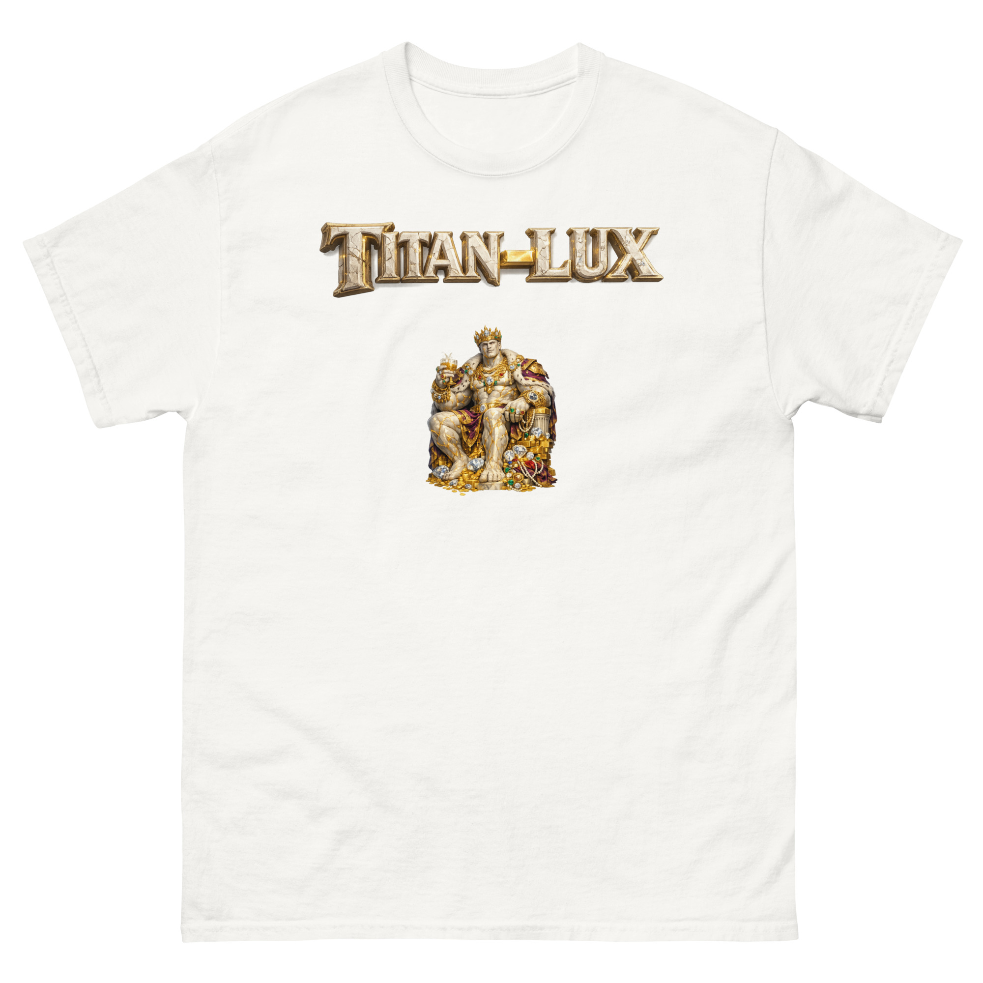 Camiseta de diseño original JOSANGO que juega con la metáfora del poder, la resistencia y el lujo. TitanLux representa a un titán rodeado de riqueza y solidez, una imagen que evoca fortaleza, calidad y presencia. Un guiño visual inteligente que habla de lo que dura, lo que cubre y lo que deja huella.